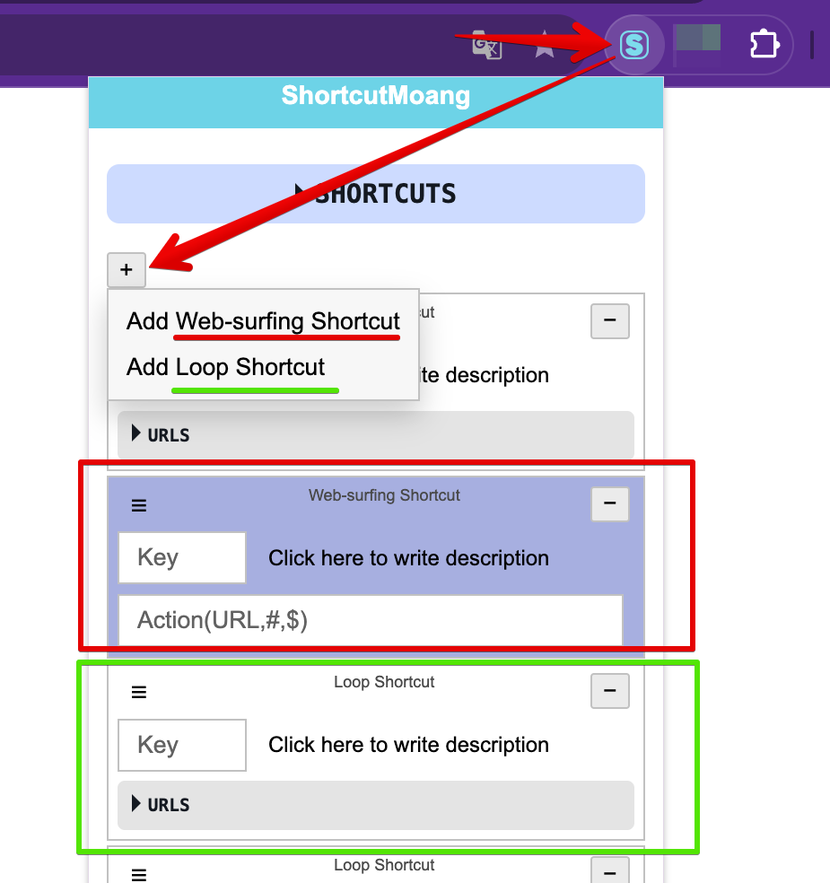 In the pop-up window that appears by pressing the pop-up icon, you can select and add two types of shortcuts by hovering your mouse over the + button.
