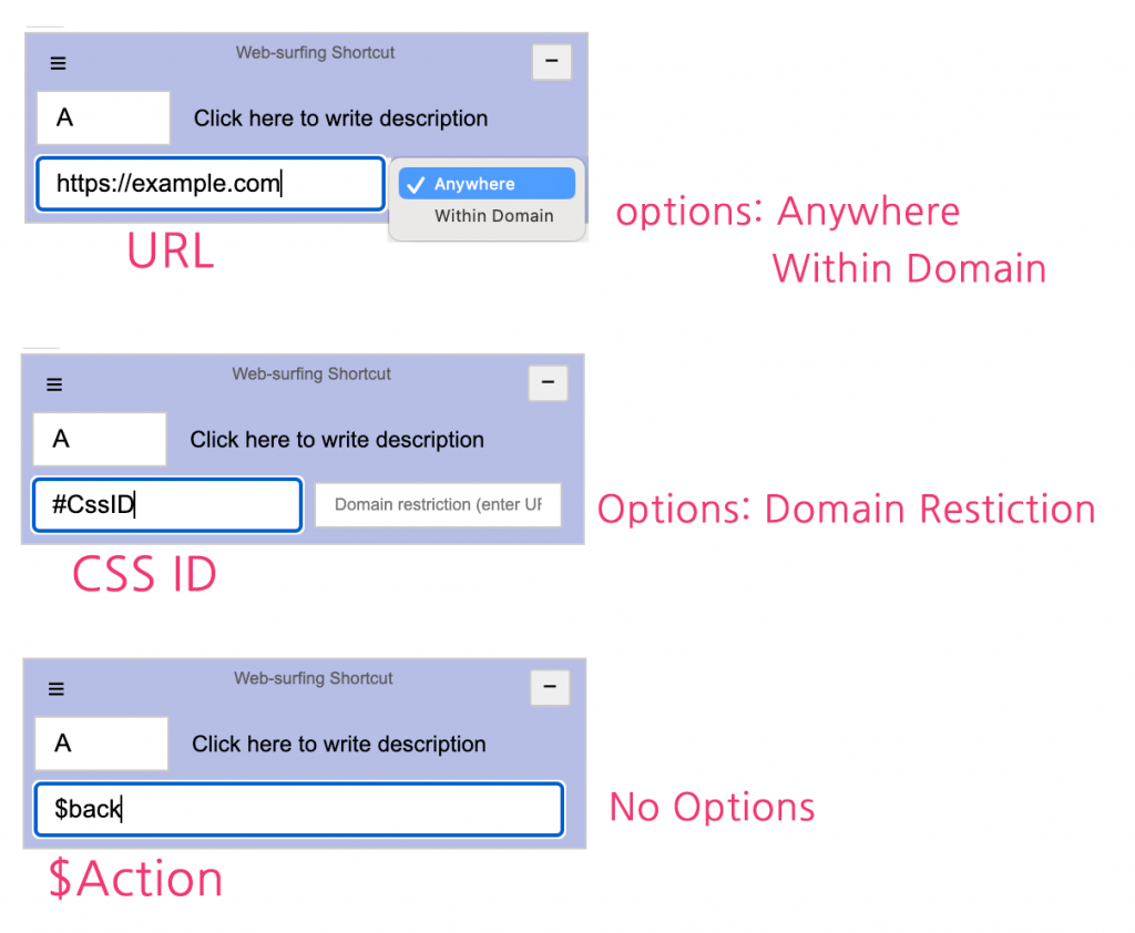 You can specify one of three actions when a shortcut is pressed. Depending on what you put in the action field, there will be an option field next to it.