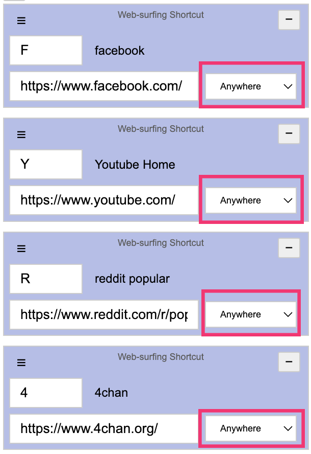 - Anywhere: Pressing this shortcut will take you to the URL no matter where you are on the website.