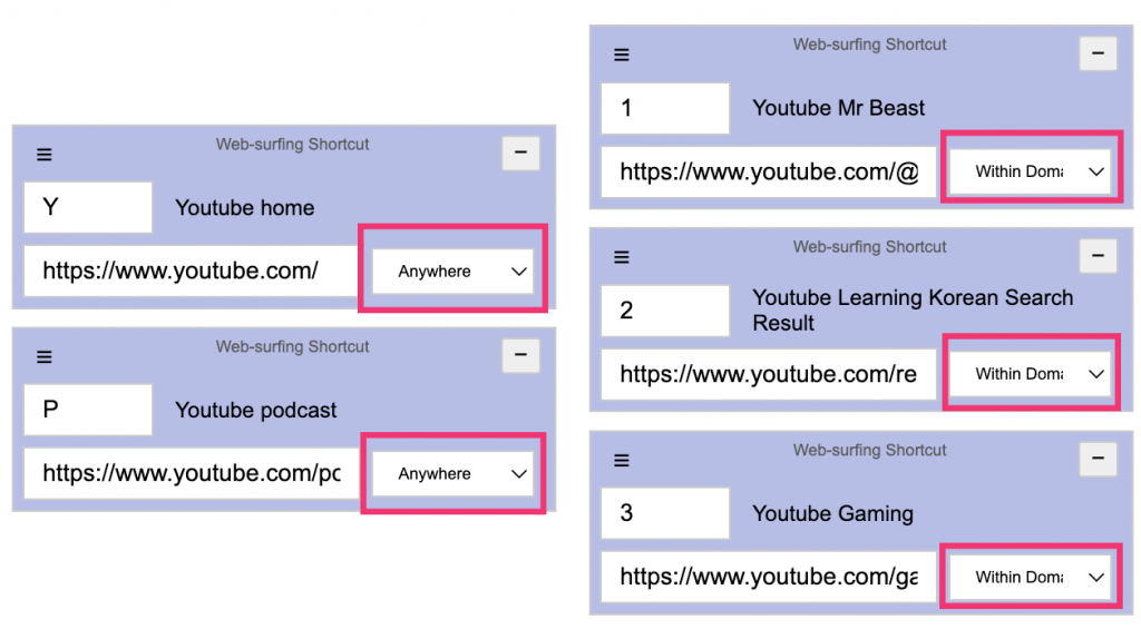 As you can see on the right, the 1,2,3 keys only work for channels within the domain, so pressing 1,2,3 won’t work on other sites, but on the YouTube site, you can go to your registered channel from anywhere. Or, if you set the channels to the ‘Anywhere’ option, you can go directly to the channel even if you are on another site.